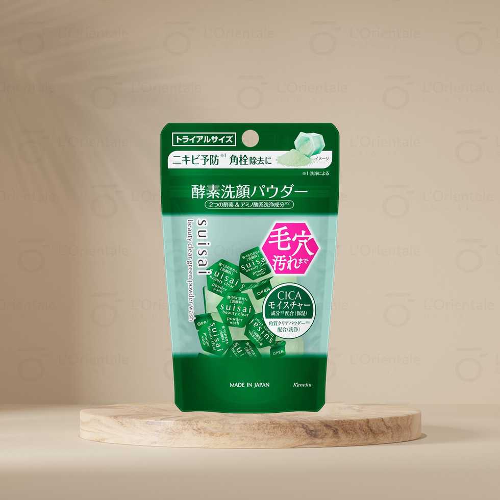 Suisai Beauty Clear Green Powder Wash is an enzyme powder that combines two enzyme activities (protease and lipase) with Centella Asiatica extract and an antibacterial complex.